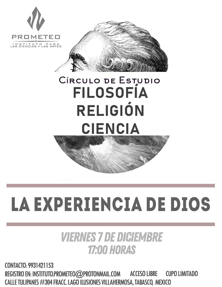 La próxima sesión del Círculo de Estudios en Filosofía, Religión y Ciencia de Instituto Prometeo se llevará a cabo el viernes 7 de diciembre de 2018 a las 17:00 hrs. La discusión versará en esta ocasión sobre «La experiencia de Dios».